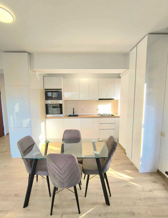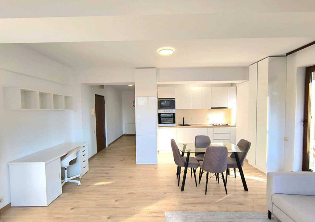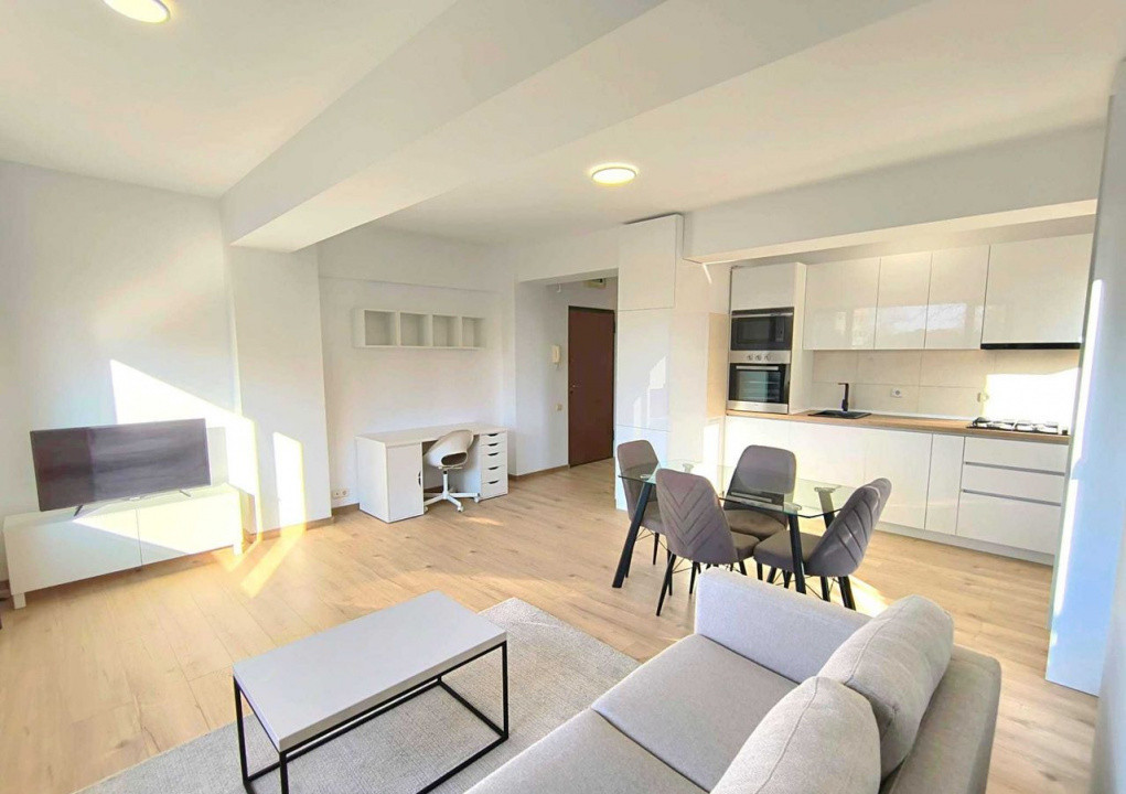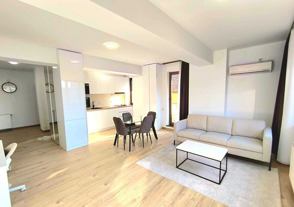 Cauți un apartament luminos într-o zonă liniștită din Băneasa, aproape de lac? Acest apartament de 2 camere oferă 70 mp utili și o terasă de 10 mp, fiind orientat sud, cu vedere deschisă și multă lumină naturală. Locuința este complet renovată modern, cu mobilier și electrocasnice noi integrate, finisaje premium și multiple spații de depozitare. Compartimentarea include hol de acces, living spațios cu bucătărie open space, dormitor, baie și terasă generoasă. Apartamentul beneficiază de aer condiționat în living și dormitor, mașină de spălat vase și zonă de birou amenajată pentru lucru de acasă. Proprietatea include loc de parcare și boxă la subsol, cu acces facil către mijloacele de transport și principalele puncte de interes din zonă. Hai la vizionare!