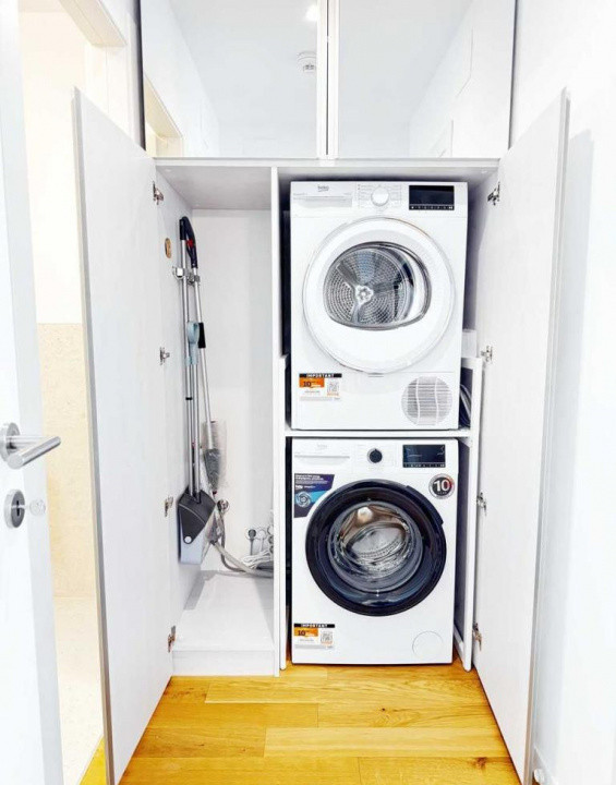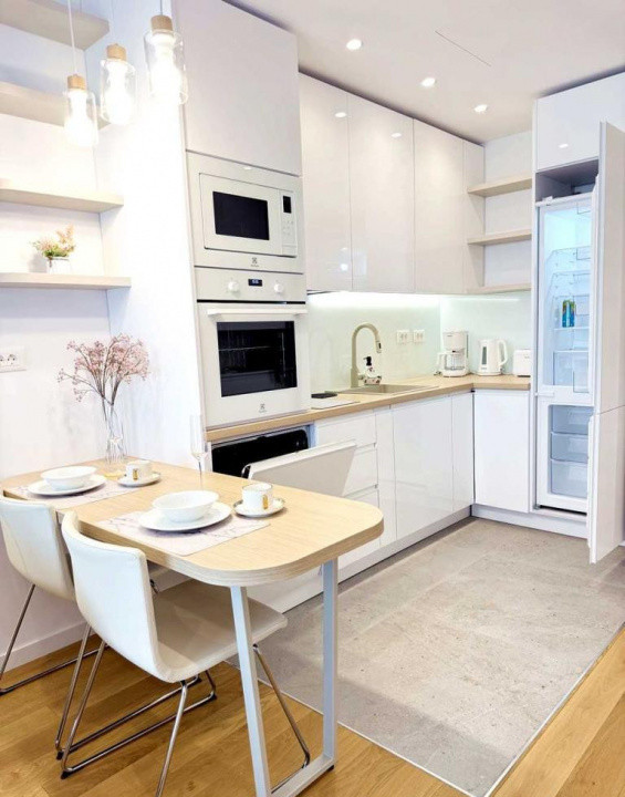 Livingul include zonă de bar cu frigider pentru vinuri și dressing generos, iar bucătăria open space este echipată cu frigider și cuptoare încorporabile, plită cu inducție, mașină de spălat vase și accesorii moderne. Dormitorul oferă pat matrimonial 160x200, dulap mare și finisaje elegante cu tapet premium.