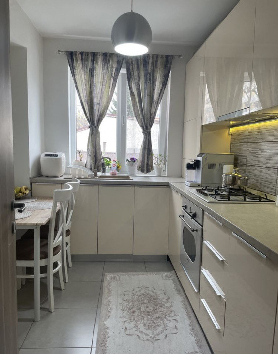 Acest apartament decomandat de 2 camere, cu finisaje premium și mobilă de calitate, este situat la etajul 1 al unui bloc de 3 etaje cu doar 9 apartamente, beneficiind de curte interioară privată, poartă automată și garaj. Suprafața utilă de 56 mp include două balcoane, dormitor mobilat complet cu dressing spațios, living generos cu canapea extensibilă și birou de lucru, bucătărie închisă și echipată complet, precum și baie modernă cu mașină de spălat rufe. Apartamentul dispune de centrală termică proprie, aer condiționat, interfon și camere de supraveghere.