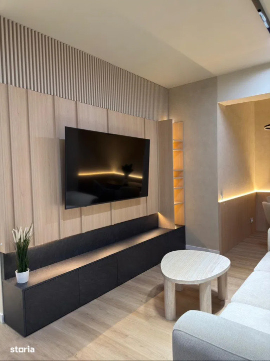 Bucătăria este complet utilată, iar locuința beneficiază de aer condiționat, TV Smart, iluminat ambiental LED și multiple spații de depozitare.