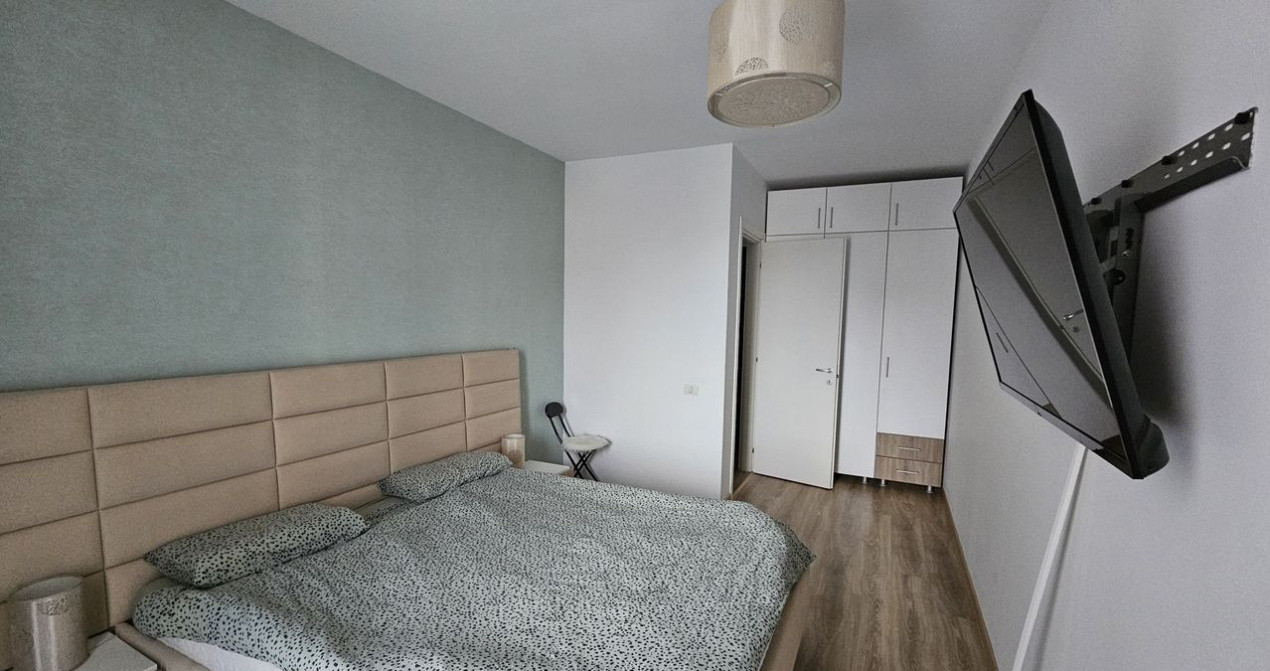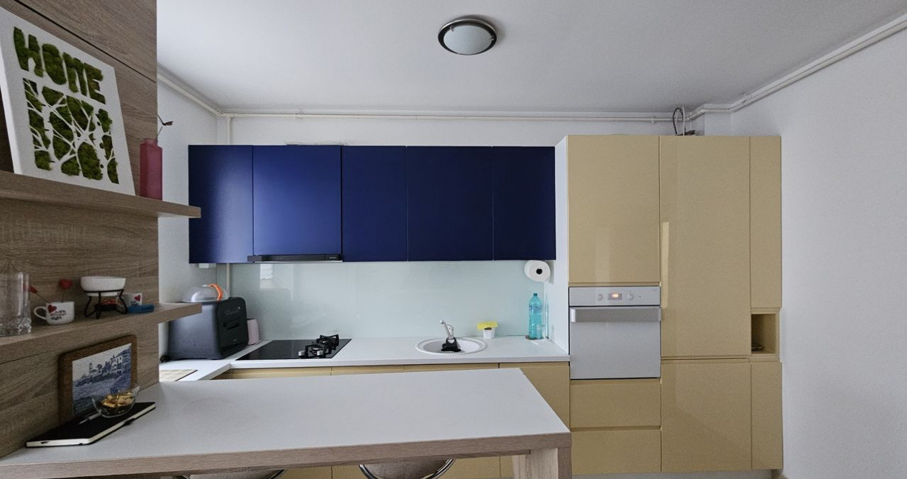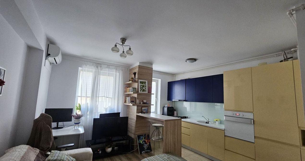 Îți propun spre închiriere un apartament cu 2 camere, 50 mp + balcon, situat la etajul 3 din 8, cu dormitor și living cu bucătărie open space. Este prima închiriere și se oferă complet mobilat și utilat, pregătit pentru mutare. Apartamentul dispune de canapea extensibilă, aer condiționat, senzor de gaze, bucătărie complet utilată cu cuptor electric, aragaz combinat inducție + electric, mașină de spălat vase și airfryer, bar cu scaune, 2 televizoare smart și mașină de spălat.