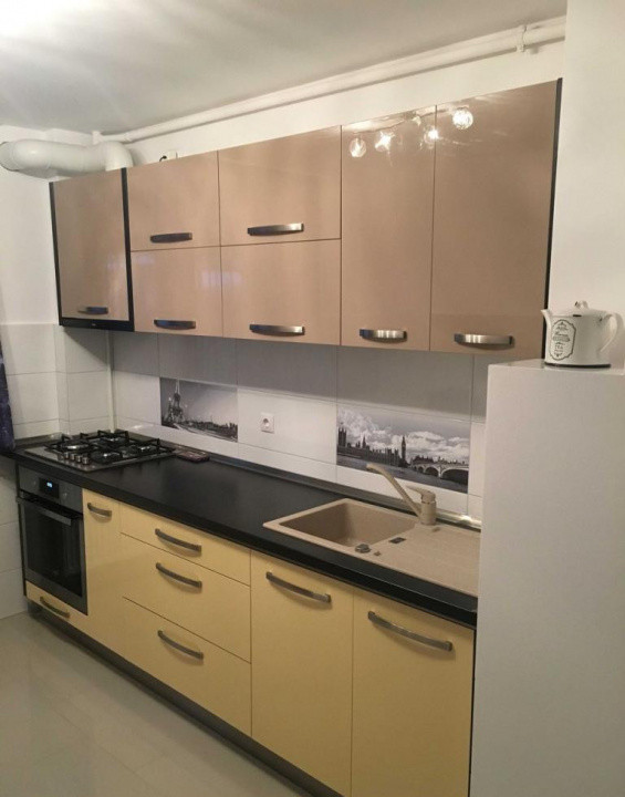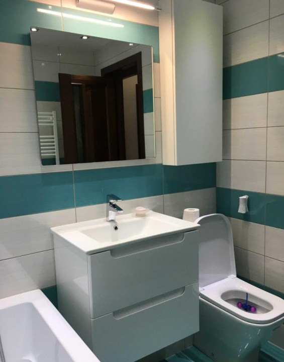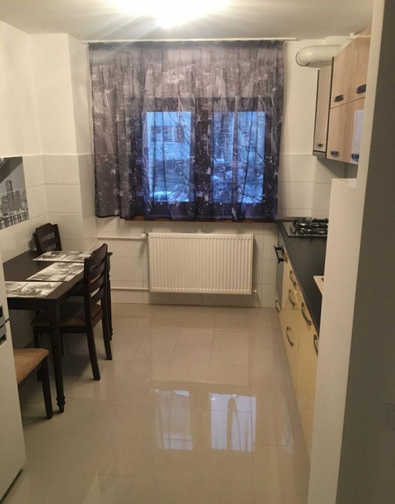 Se închiriază complet mobilat și utilat, cu mobilier modern și electrocasnice de calitate: pat matrimonial, canapea extensibilă, aer condiționat Mitsubishi Electric, mașină de spălat Whirlpool, plită și cuptor încorporat, televizor LG și conexiune Wi-Fi.