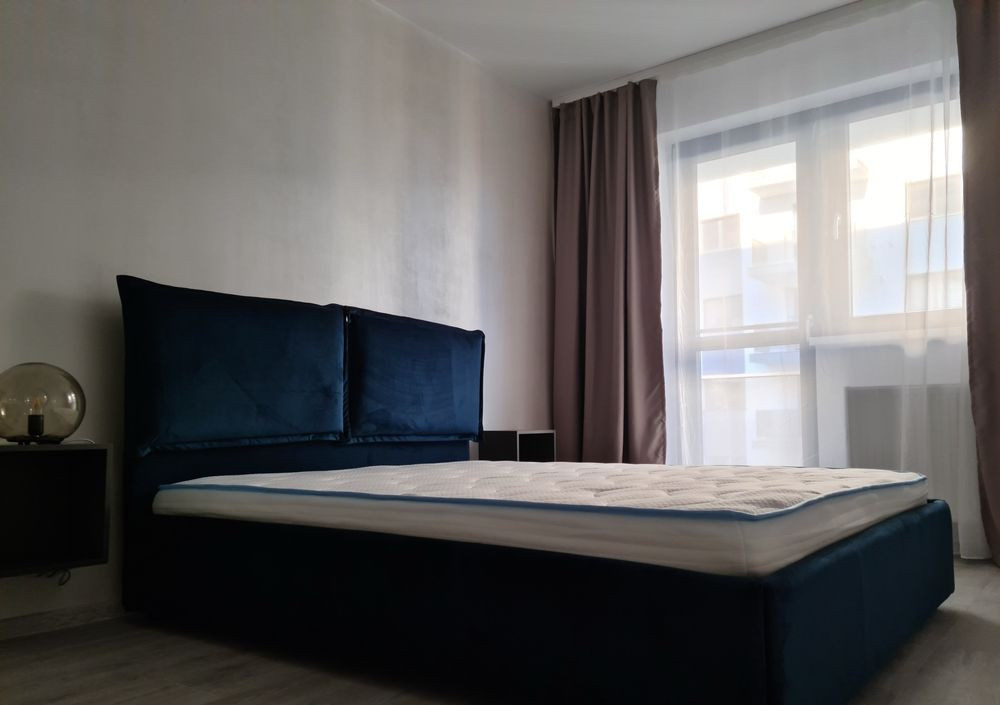 Apartamentul este complet echipat cu mobilier modern și electrocasnice (TV, frigider, cuptor, plită, mașină de spălat, aer condiționat).