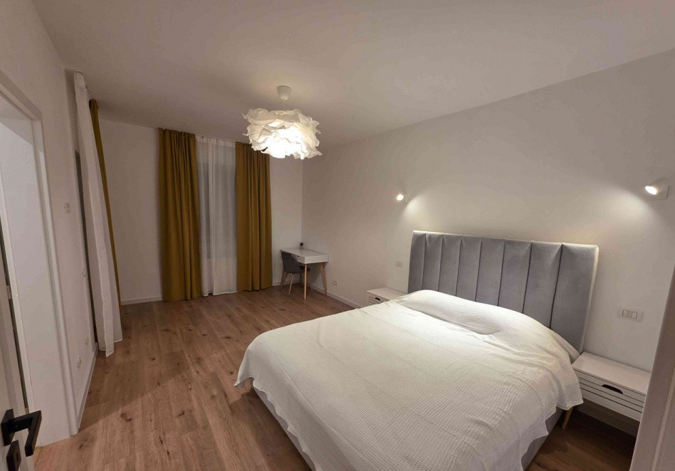 Dotările includ mașină de spălat rufe cu uscător, mașină de spălat vase, frigider, plită, cuptor, hotă, televizor LED de 125 cm, filtru de apă potabilă, aer condiționat wireless, centrală termică cu control prin aplicație și încălzire în pardoseală în baie. Apartamentul se închiriază împreună cu un loc de parcare subteran foarte spațios, prevăzut cu posibilitate de încărcare pentru mașină electrică.