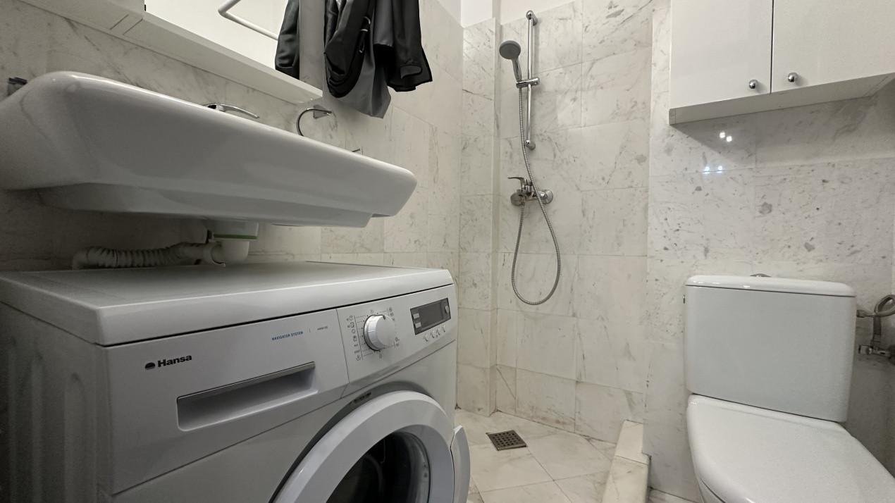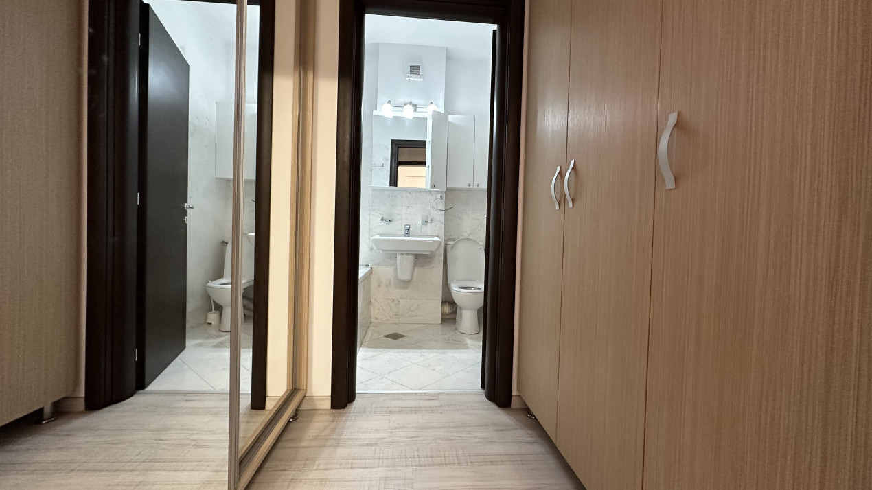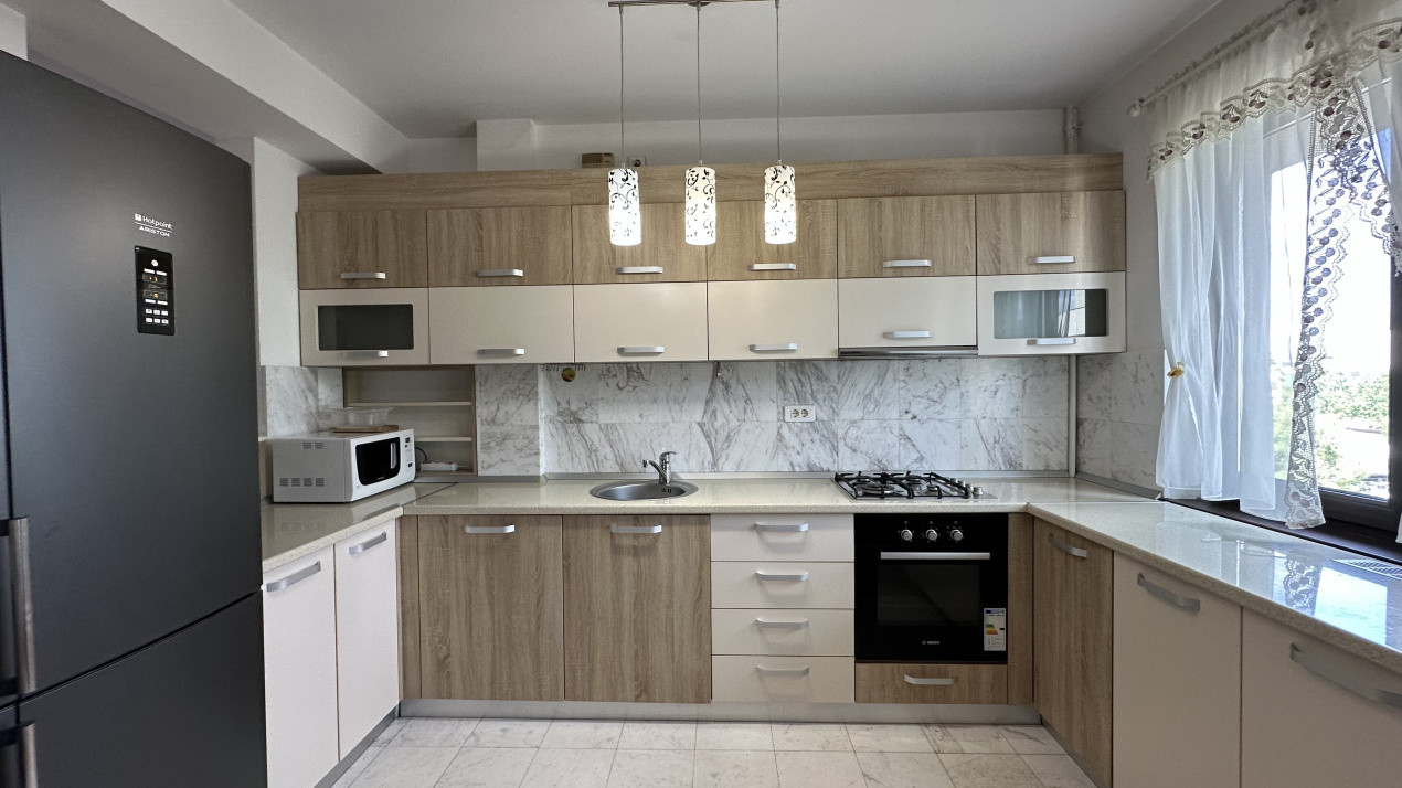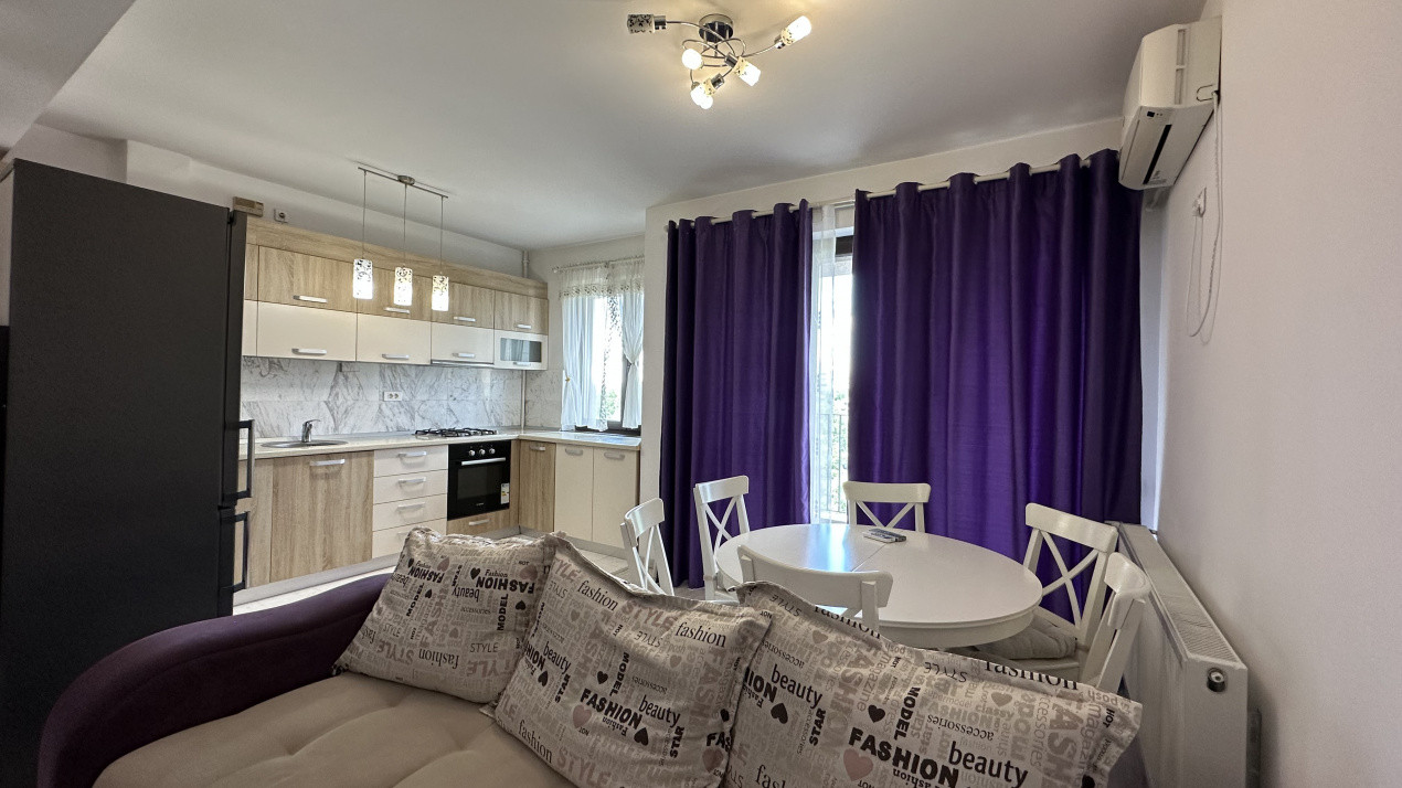 Apartamentul are o suprafață generoasă de aproximativ 85 m², cu 2 băi (una matrimonială), complet mobilat și utilat: mașină de spălat, Smart TV, 2 aparate de aer condiționat, cuptor electric, plită pe gaz, combina frigorifică și multe spații de depozitare.